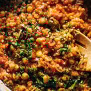 My boyfriend and I made this tonight—we both loved it! I added a diced eggplant to this because I wanted to add a little more volume. I cooked the eggplant at the beginning with the shallot. Then I mashed both with the chickpeas and followed the recipe as is (I did 2/3 water so it wouldn’t be too watery).